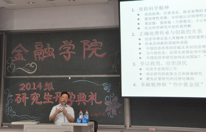 开学典礼之后,张礼卿院长做了题为“治学的精神和方法”的学术讲座。张院长详细介绍了金融研究的基本过程、研究方法、文献阅读和综述撰写,着重讲述了阅读文献的方法和重点,并向同学们强调了写作的学术规范性,提醒同学们坚持科学精神,端正学术态度,树立优良的学风,掌握正确的研究方法,培养自学能力。