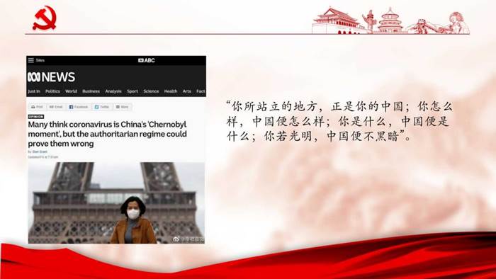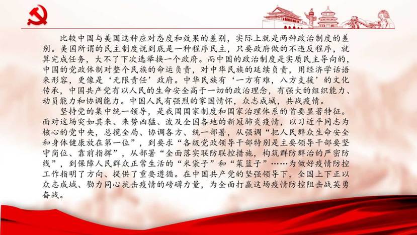 在这场生命“大考”中,社会主义集中力量办大事的优势得到了充分发挥,得到了人民群众的广泛认可和高度赞扬。同时,主流媒体对党的领导在体制优势发挥的解读方面,仍有一些需要完善的地方,虽然提出了“党的领导党的全面领导是战胜疫情根本保证”等重要观点,但是社会化媒体和公众新闻对这一主题缺少深入的分析和大量的例证,党员群众“不解渴”的现象存在,甚至还有很多境外媒体有严重误读。因此本次活动的主题就是如何理解党的领导在疫情防控中的作用,我们也将就具体的错误舆论进行批判。