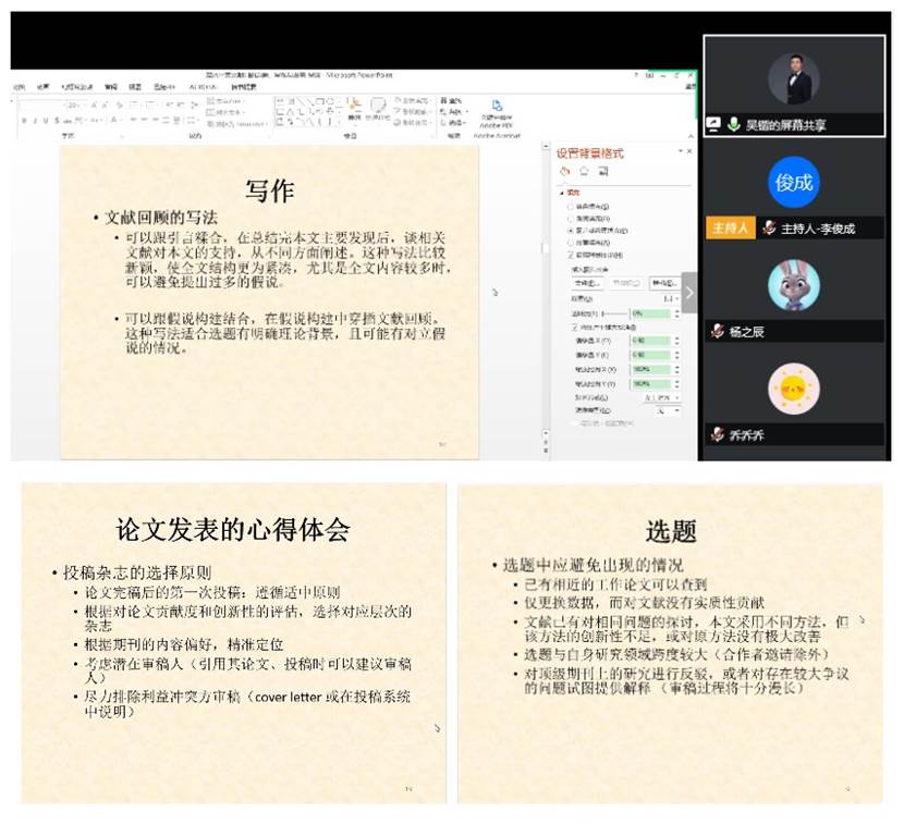 为落实教育部“不离家、不返校”的疫情防控要求,同时确保防疫、科研两不误,博士生党支部于4月24日下午举办“把论文写在祖国的大地上”主题学术沙龙暨博士生党支部第三期学术研讨会。本期研讨会聚焦“战疫情”专题,博士生党支部的何山同志、李兴申同志围绕“战疫情”做专题学术报告,金融工程系吴锴老师就“如何宅在家搞学术”与博士研究生同学展开深入交流。本次活动对外开放,太阳成官网博士研究生、硕博连读研究生共40人参加了此次活动。活动由博士生党支部书记李俊成同志主持。